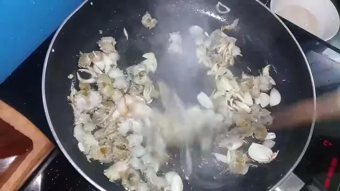 - Cho cua vào xào cùng hành khô đến khi cua chín.