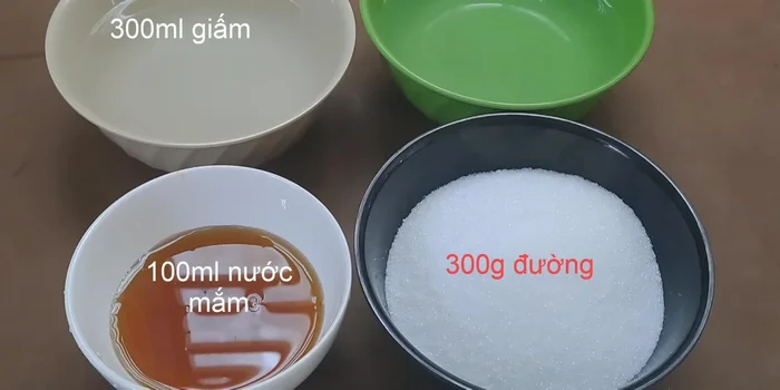 - 300g đường + 300ml nước lọc + 300ml nước giấm + 100ml nước mắm. Đun sôi cho đường tan, tắt bếp, để nguội hoàn toàn.