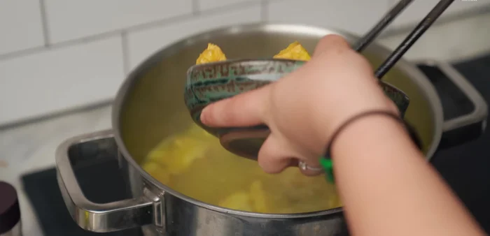 - Luộc 2 quả chuối riêng rồi dầm nhuyễn cho vào cuối cùng để tạo độ sánh.