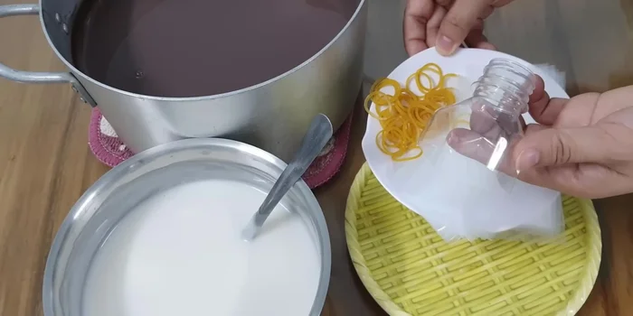 - Cho nước cốt dừa vào bịch nilon, tiếp theo là đậu. buộc chặt lại.